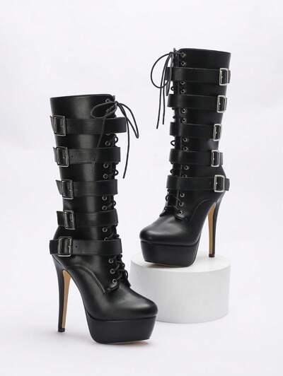 CUCCOO LuxiPop Women's Pointed Toe Chunky Heel Strap Champagne High Platform Pumps, Suitable For Halloween, Vacation, Travel, 2000s Style