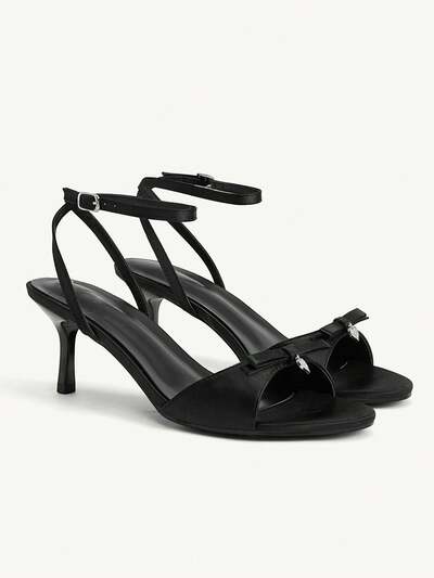 CUCCOO CHICEST Sapatos Femininos Pretos de Cetim com Laço de Cetim, Decoração com Fivela em Formato de Coração, Tira no Tornozelo, Elegância Fashionista, Temperamento Elegante, Sandálias de Salto Alto de Bico Redondo para Casamento na Primavera e Verão-14%